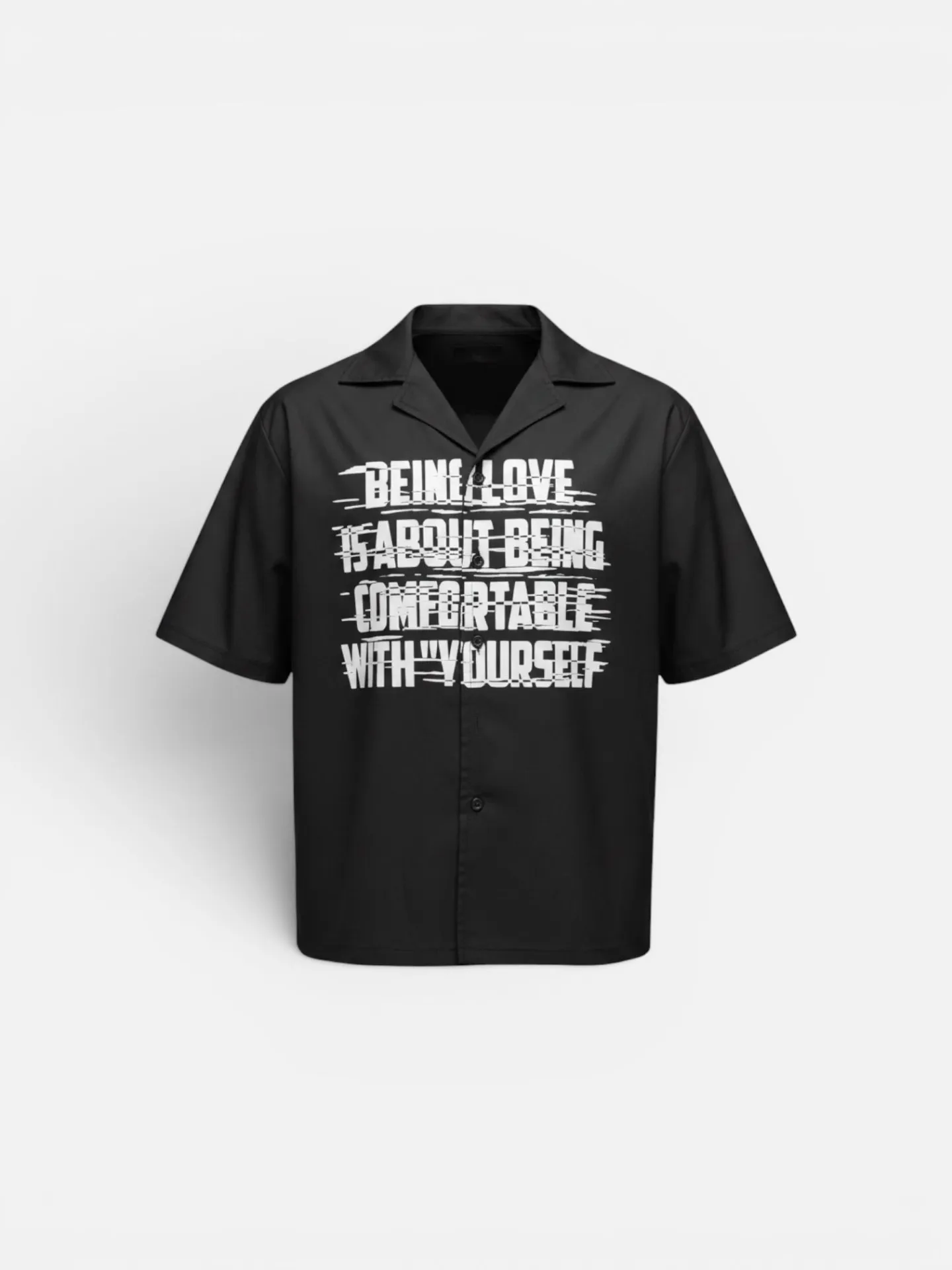 Esprimi la tua identità con questa camicia bowling total black. Il design minimal è arricchito da una potente grafica frontale con effetto "glitch" e messaggio motivazionale. Taglio boxy, colletto a rever e tessuto leggero la rendono il pezzo statement ideale per un look urban di carattere.
